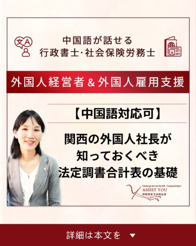 私は、関西を拠点に中国語対応の行政書士・社労士として活動しています。外国人経営者の皆様が安心して事業を続けられるよう、法的に正しく、長期的な視点で支援を行っています。